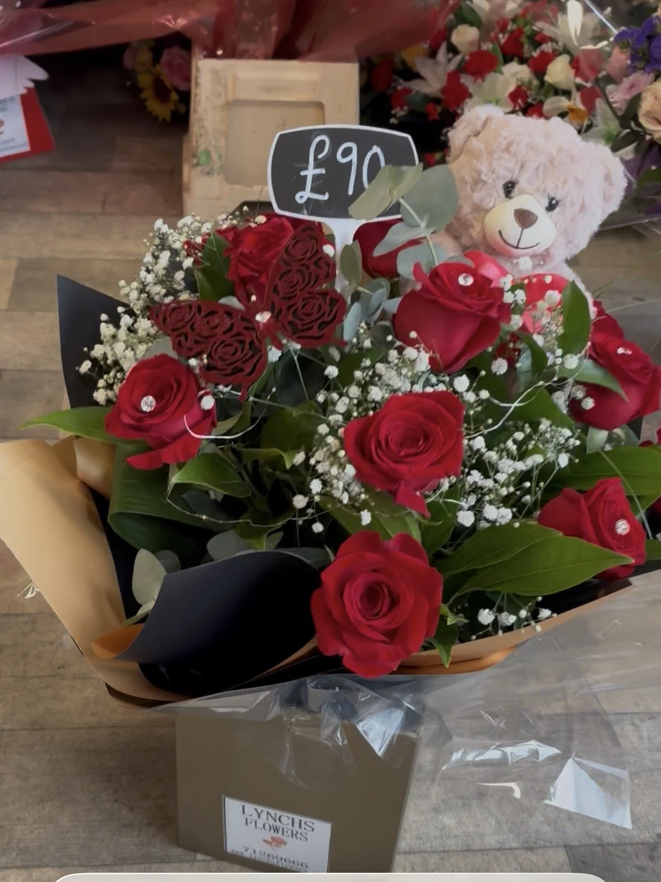 Shop › 12 Longstem Roses in a gift box with Teddy and lights Image 1 of 1 12 Longstem Roses in a gift box with Teddy and lights £90.00 Add To Cart Added!