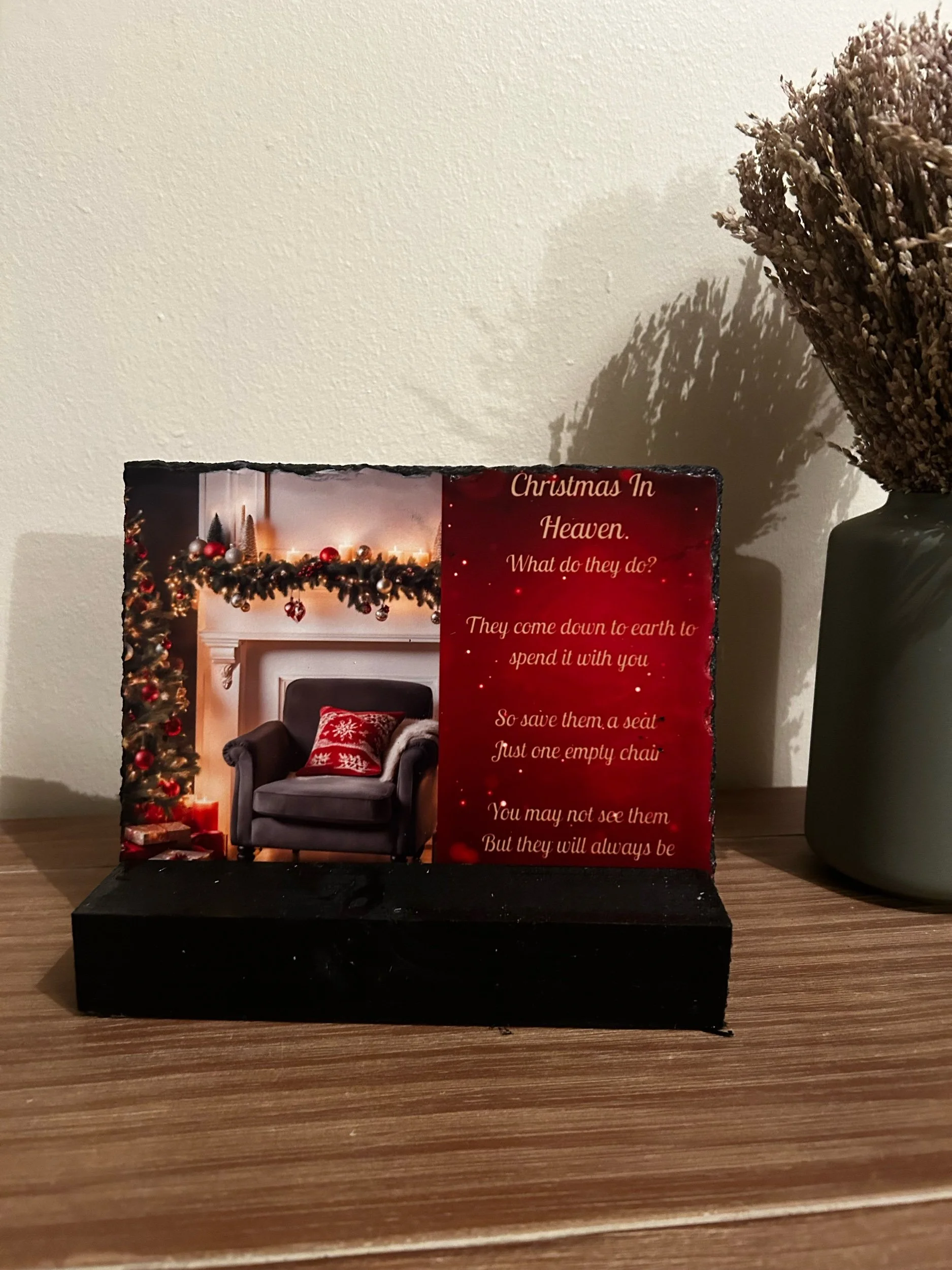 Shop › Christmas in Heaven Image 1 of 1 Christmas in Heaven £25.00 14x19cm slate with sturdy wooden stand suitable for outdoors Quantity: Add To Cart Added! 14x19cm slate with sturdy wooden stand suitable for outdoors